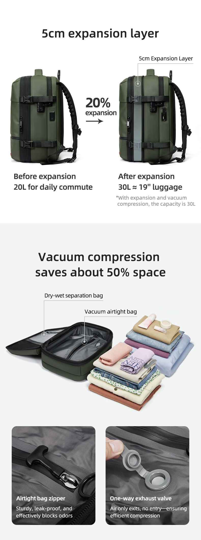 • Erweiterbarer Stauraum (20–35 l) – flexibler Platz für Arbeit oder Reisen